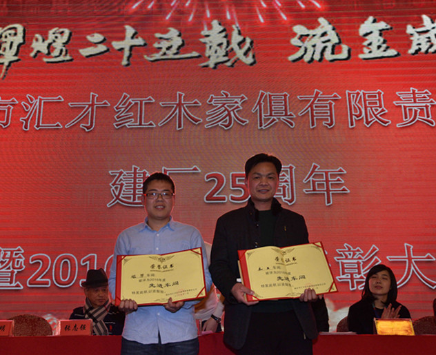 首先,汇才红木2016年总结表彰大会隆重召开。公司董事长潘福初,总经理潘一峰,董事长助理帅莉,副总经理徐富根,总经理助理潘顺明,党建指导员张伟,公司顾问张志强出席会议并在主席台就坐。会议表彰了2016年度先进车间和先进员工。经过层层打分评选,木工车间和雕花车间荣获本年度“先进车间”称号,殳阿六等22名员工荣获“先进员工”称号。这次评选工作充分发扬了民主、公平、公正、公开的原则,全体中层管理人员共同讨论,全体员工积极参与、实事求是,顺利完成本次评选工作。