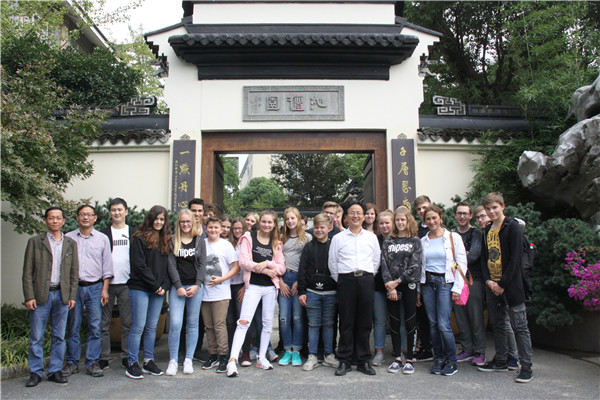 德国马尔市·洛坎普一级文理中学交流团的友好学校桐乡市高级中学教师沈炳发,汇才红木总经理潘一峰等陪同参观,并与师生们合影留念。