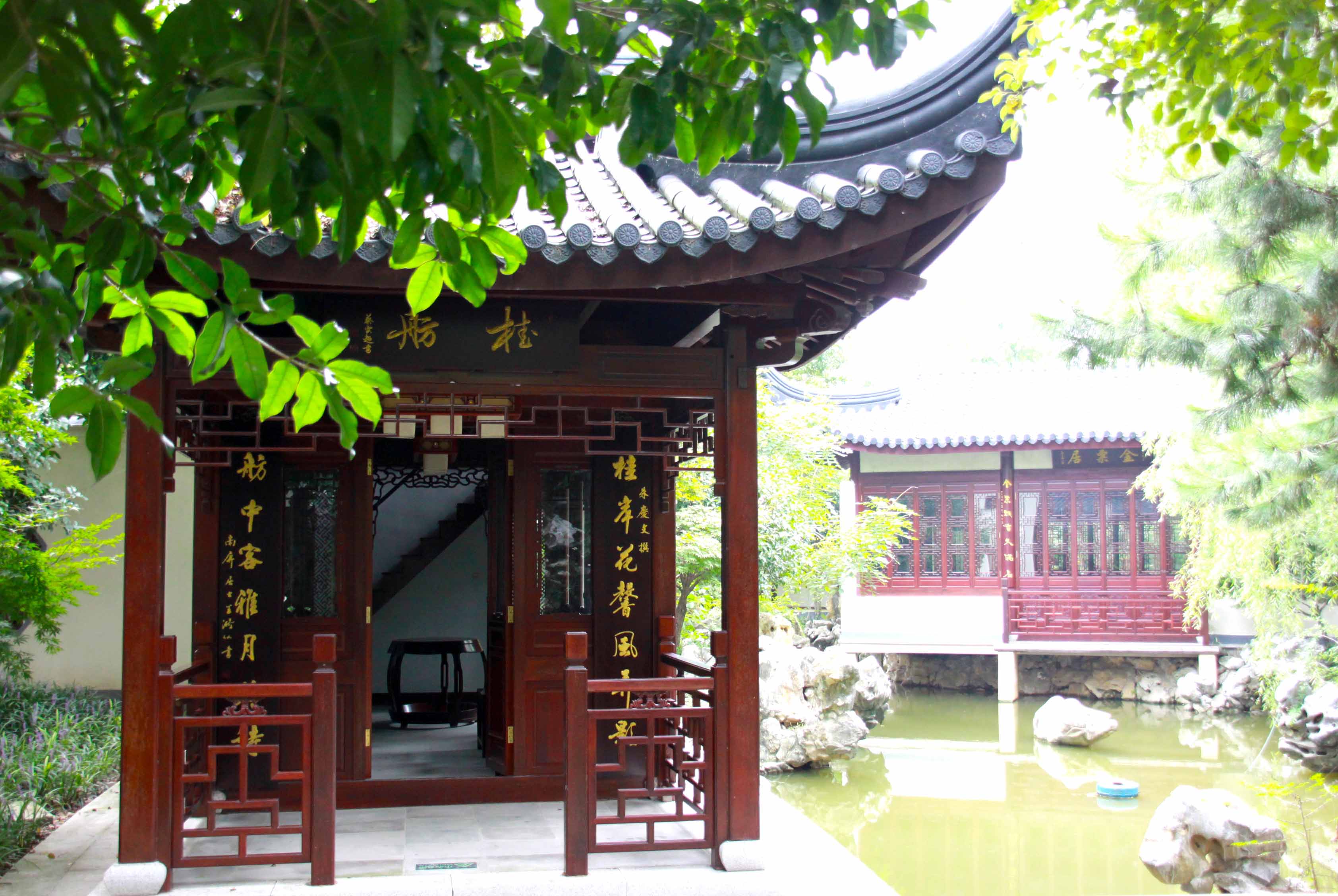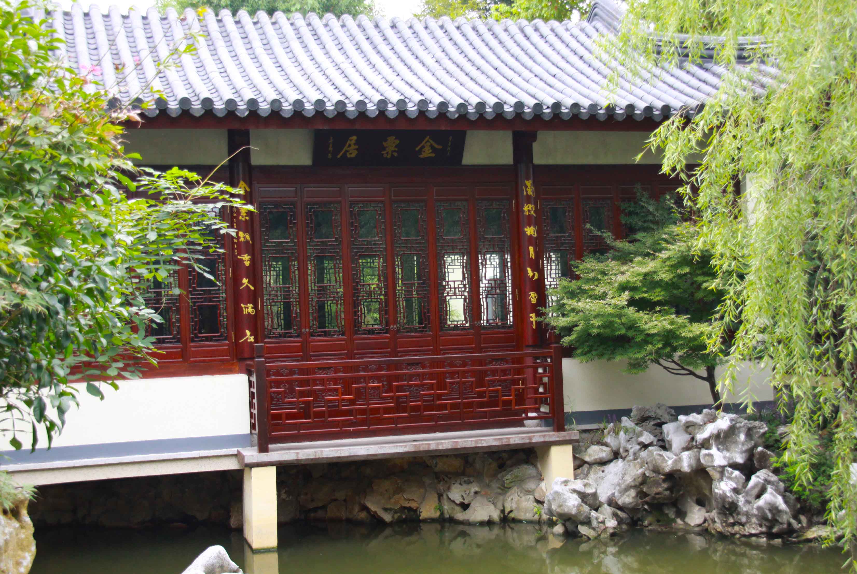 进月洞门向前有小径可达桂舫,向左则为一小庭院,院内有桂树及湖石孤峰,故名“金粟居”,三开间书房架池而建,立于水面之上,环境幽美清朗,落地窗的室内,置红木画案书架,苏作明式家具,简洁精致,静雅墨香。“翰逸神飞”横匾点明了此间为挥毫泼墨之雅室。
