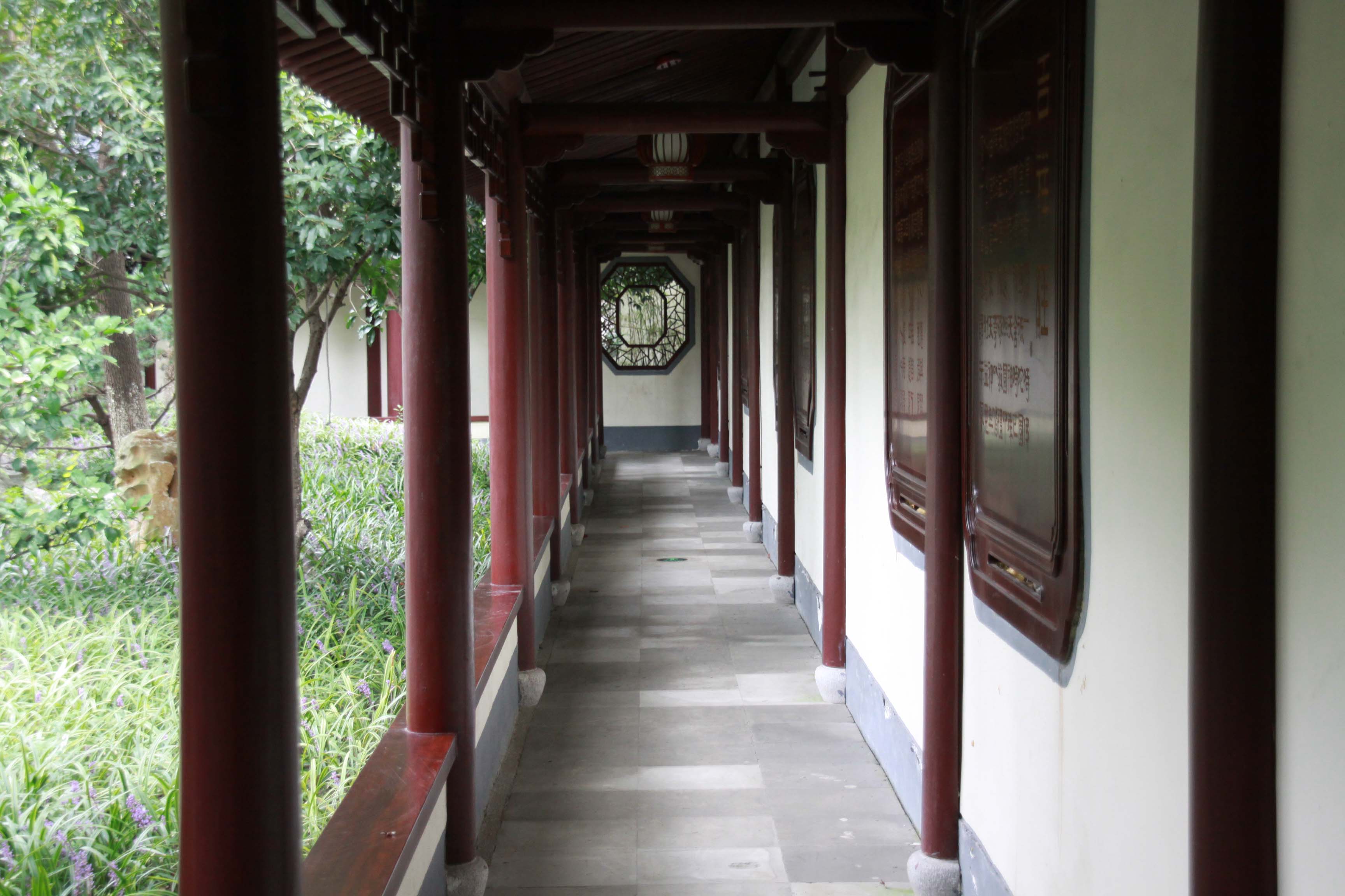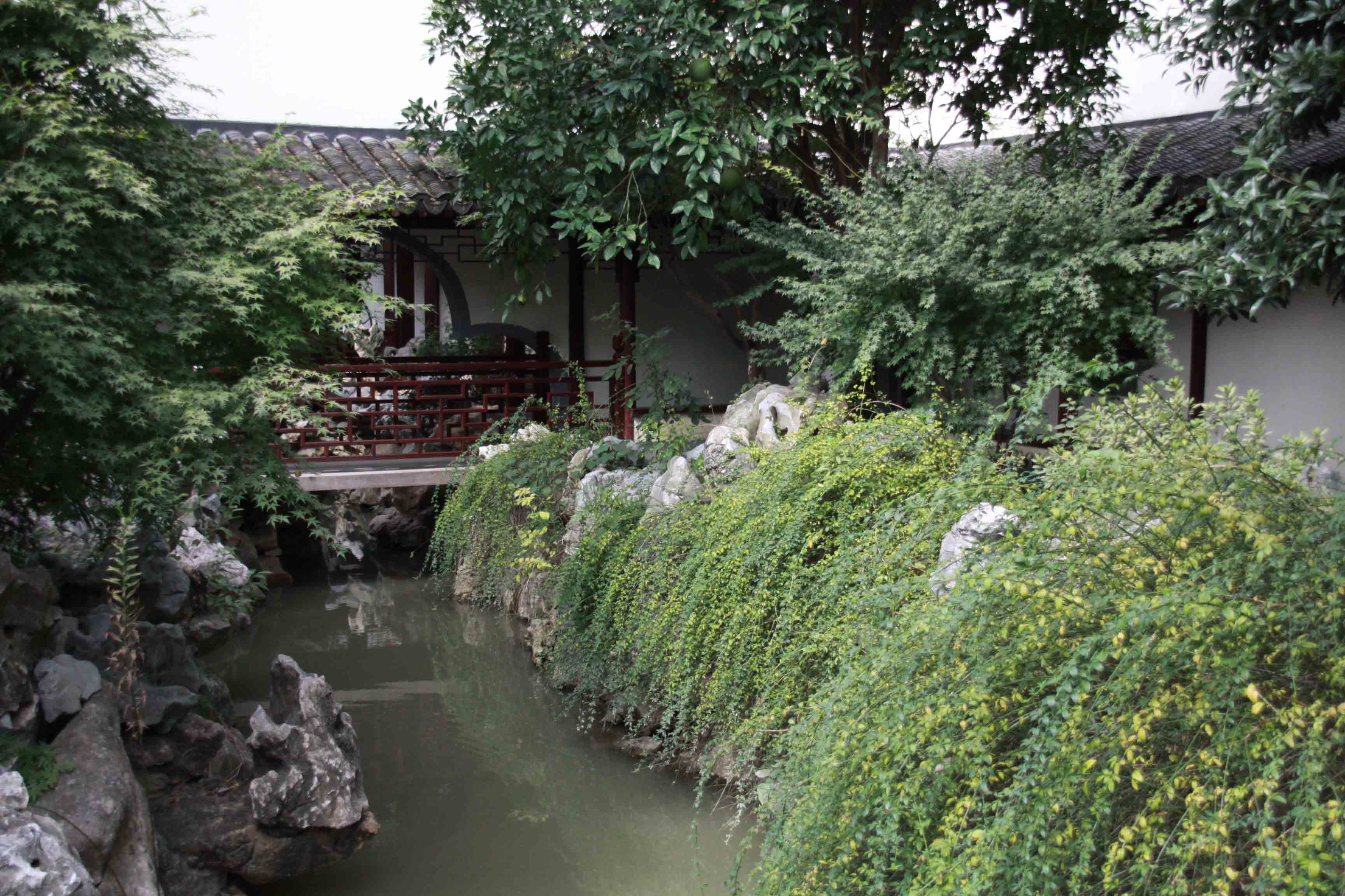 具美亭南一池清水,池水向东,穿廊下入东园,与东园水系连通。廊下平桥有美人靠,在此闲坐西可赏池沼假山,向东透过园形月洞门,可窥东园景色。