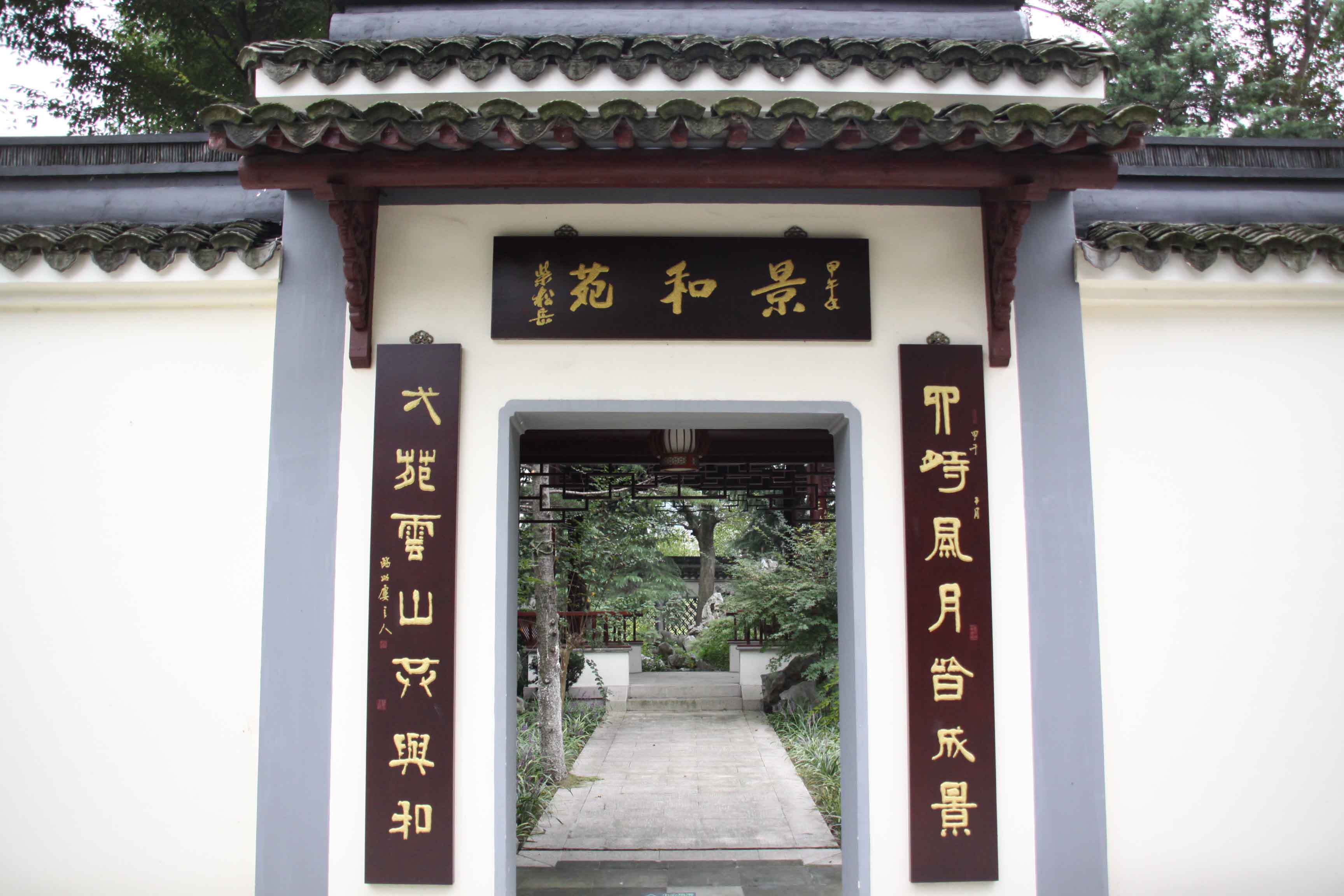 步入园内,右侧围墙有门洞开,上有“景和苑”匾额,取“春和景明”句意,由原浙江省省长柴松岳题写。进门以迴廊花窗将沁檀园分割成东西两园,西园以疏朗自然见长。