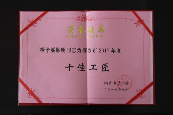 他技术能力过硬,为人谦虚,兢兢业业做事,踏踏实实做人,刻苦钻研,精益求精,创建“潘顺明高技能人才工作室”。严格要求自己,加强学习,不断提高自身修养和思想认识,在工作中积极主动,充分发挥先锋模范带头作用。他的工作态度和管理能力,以及深入一线,十几年如一日的坚持,获得了公司全体员工的认可。今年,获得桐乡市“十佳工匠”荣誉称号。
