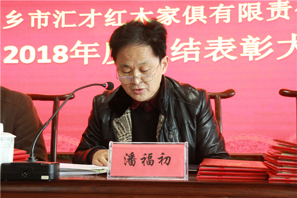 总结过去,展望未来。1月25日,汇才红木2018年度总结表彰大会在公司四楼会议室顺利召开。公司全体员工参加会议,董事长潘福初,公司顾问张志强,副总经理徐富根、潘顺明,张伟出席会议并在主席台就坐。